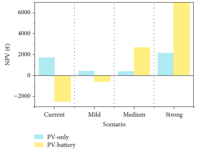-电池储能(光储)系统进行了住宅场景应用的实验探讨,结合仿真模拟,分析了电池的引入对能源系统能量与经济特性的影响,使用净现值法对该系统进行了全生命周期评估,并对不同电力政策和技术成本下的系统配置进行优化。研究结果表明,电池储能的存在降低了能源系统的午间光伏馈网功率和晚间峰值用电需求,有利于降低电网的电压波动和峰值负荷;基于目前中国的能源制度背景,光储系统在住宅建筑尚不具有经济可行性。然而,考虑到未来电力市场、能源政策和技术成本的变化趋势,光储能源系统的投资将逐渐趋于正收益,并比纯光伏系统(不具备电池储能)更具投资潜力。