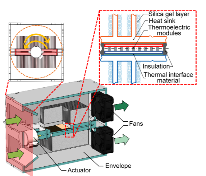 传统除湿技术在面对微环境控制需求时,既无法避免过冷/过热引起的空气显热损失,又难以小型化。同时,现有小型除湿技术仍面临能效低、适应性差等问题。类比于热泵可以将热量从低温环境搬运至高温环境的功能,文中提出的“湿泵”可以将空气中的水分从低湿度空间搬运至高湿度空间,从而实现对湿度的主动控制。该文构建了系统级的动态计算模型,同时使用商用热电模块和硅胶除湿剂搭建了概念验证样机。通过特殊的涂层工艺和紧凑的结构设计,有效降低固态系统的接触热阻与传质阻力。典型工况下的测试结果优于其他已报道的小型除湿系统。此外,该除湿装置可以有效避免传统技术中制冷剂,冷凝水,溶液等产生的副作用,为小空间除湿需求提供了更有潜力的策略。