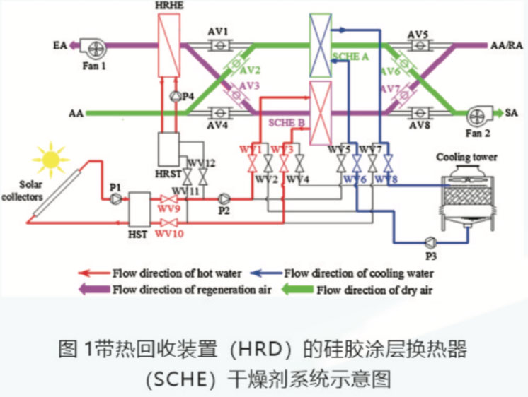 设计的系统主要由干燥剂除湿子系统和热回收子系统两个子系统组成。干燥剂除湿子系统由两个吸附材料涂层换热器( sorptive material coated heat exchanger, SCHE A