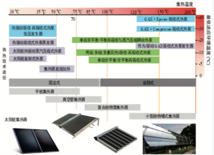 理论上,热能驱动的常规吸收、吸附式热泵结合太阳能集热器可用于供暖,但以水为工质的吸收或吸附式热泵难以满足寒冷环境要求,采用氨等低沸点工质的热泵系统要求驱动热源温度较高(一般大于120°C),完全依靠太