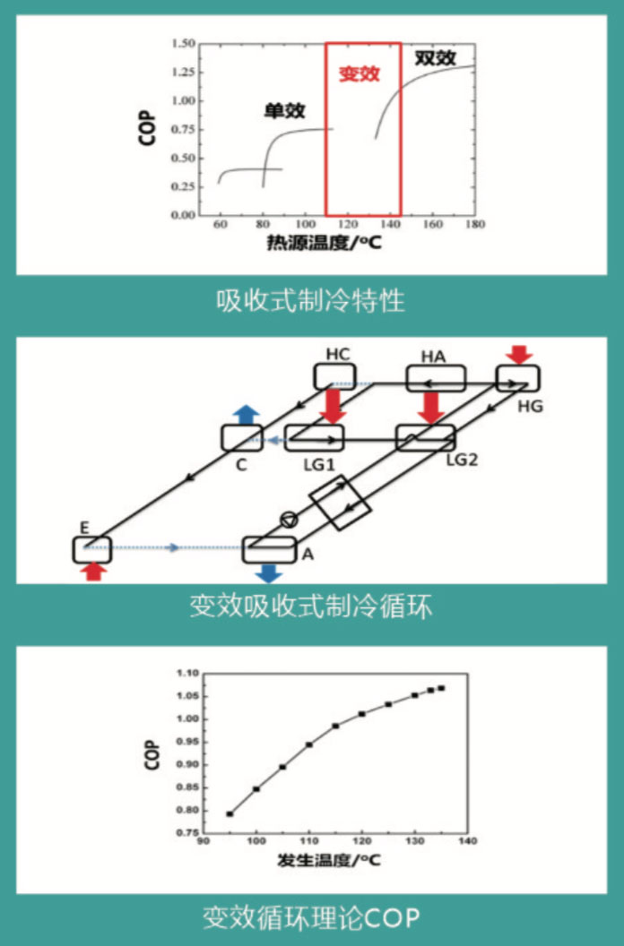 太阳能与低品位工业余热提供的热源具有温度不稳定性等特征,主要温区集中在60-200℃,而传统的单效和双效吸收式制冷分别可以对85 100℃C以及140℃以上的热源进行高效利用并分别达到0.7和1.1的