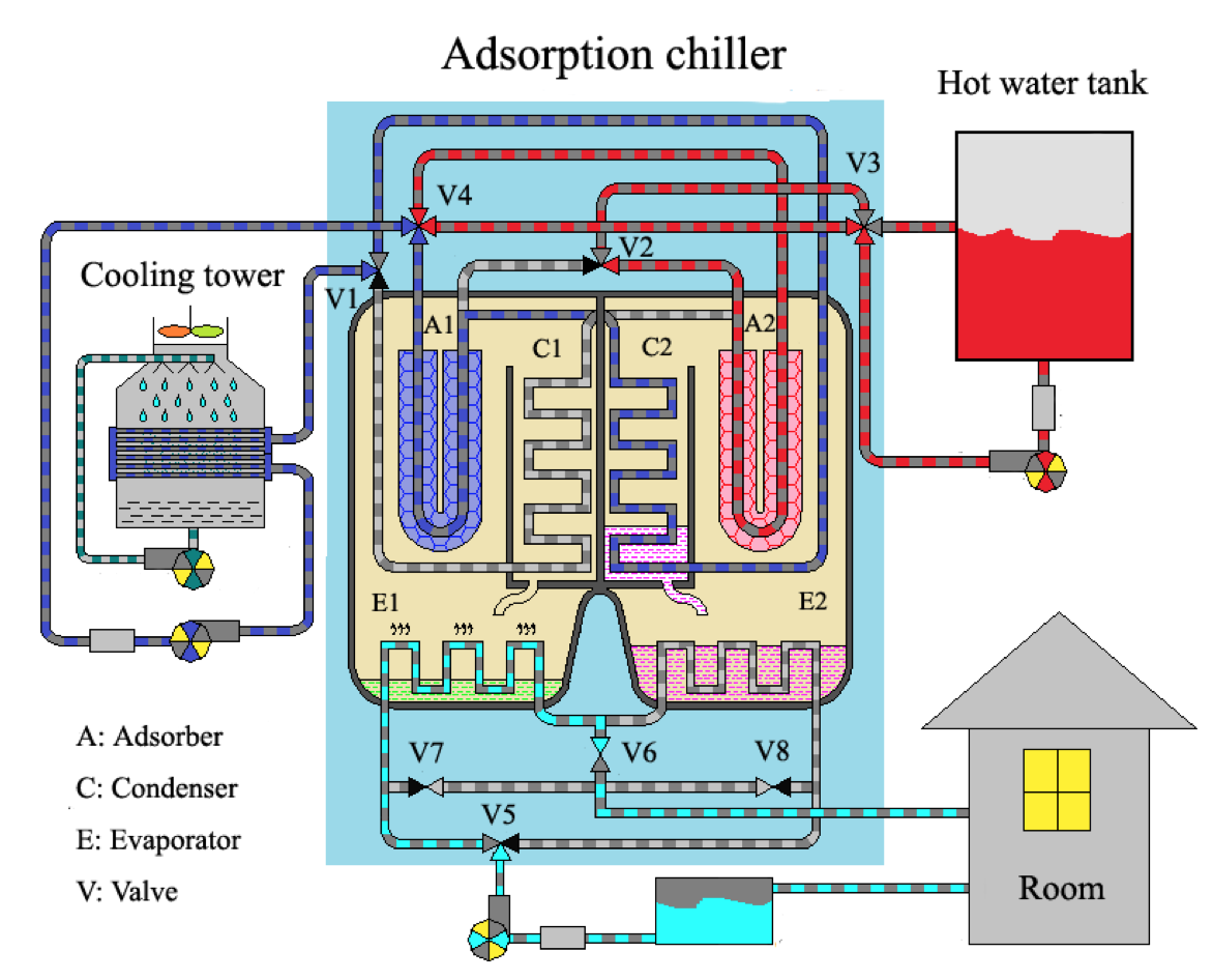 吸附式制冷是一种绿色环保的制冷技术。采用硅胶-水为工质对,吸附式冷水机组能够在50-95°C热源条件下,制取7-20°的冷水,满足空调冷却的使用。 系统特点: 硅胶水吸附式系统采用回热回质的高效循环,
