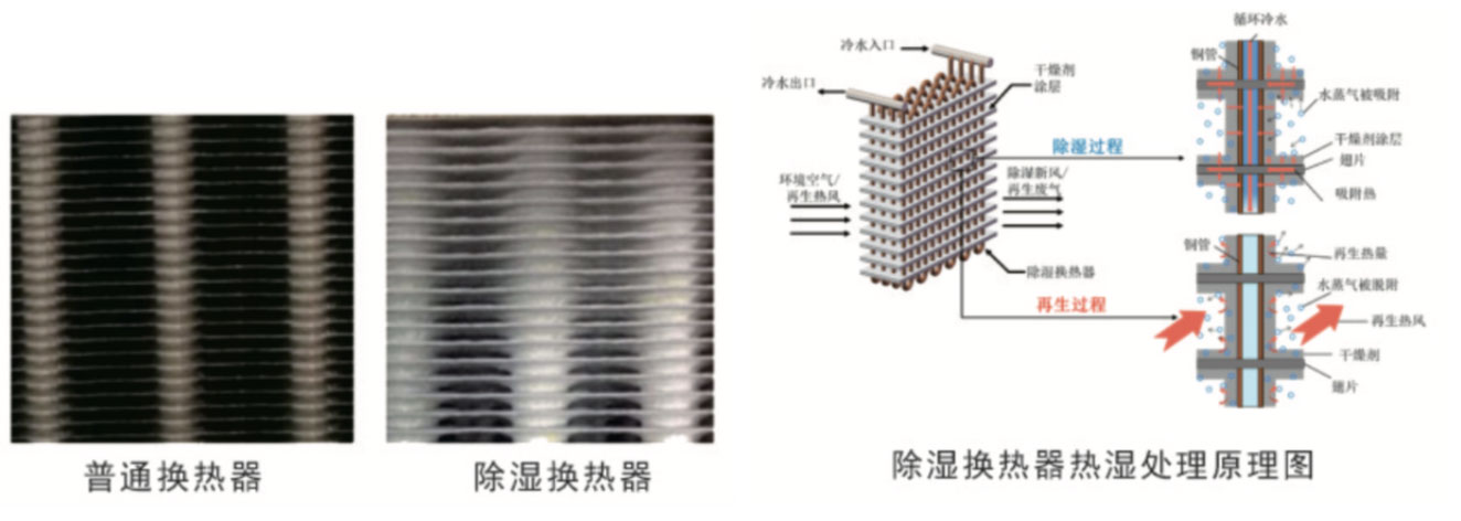 除湿换热器是一种可有效克服吸附热、改善干燥剂除湿性能的除湿方法。它通过将固体干燥剂材料涂覆在传统金属管翅式换热器的翅片表面上在除湿过程中不仅可以有效吸附湿空气中的水分,而且还可以通过管内流动的冷却水将吸附过程中固体干燥剂释放的吸附热及时带走,减少除湿过程不可逆损失。与其他除湿方法相比,除湿换热器在继承了固体干燥剂除湿方法优点的同时,还具有结构简单,成本低,应用灵活,吸附热影响小等显著特点。