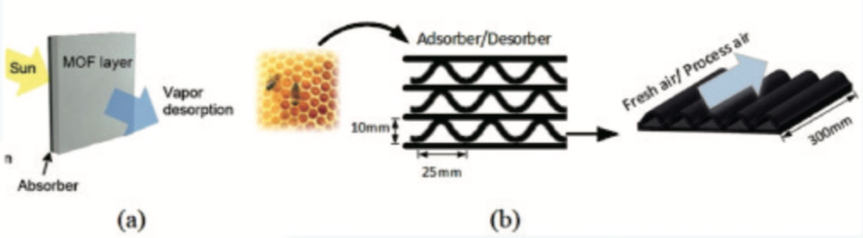 淡水短缺严重制约着人类的生存发展,而我国存在水资源分布不均,人均少等客观不足,特别在偏远的沙漠海岛地区,传统的淡水运输供应困难且成本高昂,在类似突发灾害、人员流动分散等状况下面临挑战,因此研发灵活、节能的取水技术迫在眉睫。大气淡水储量巨大,从空气中获取淡水可突破地域限制,具有普适供水的优点。吸附过程:开式循环、夜间进行,将潮湿的空气通入取水装置,利用蒸汽压力梯度,水蒸气被吸附剂吸附,汽化澘热转化为显热,气流温度升高,废气排出系统。
